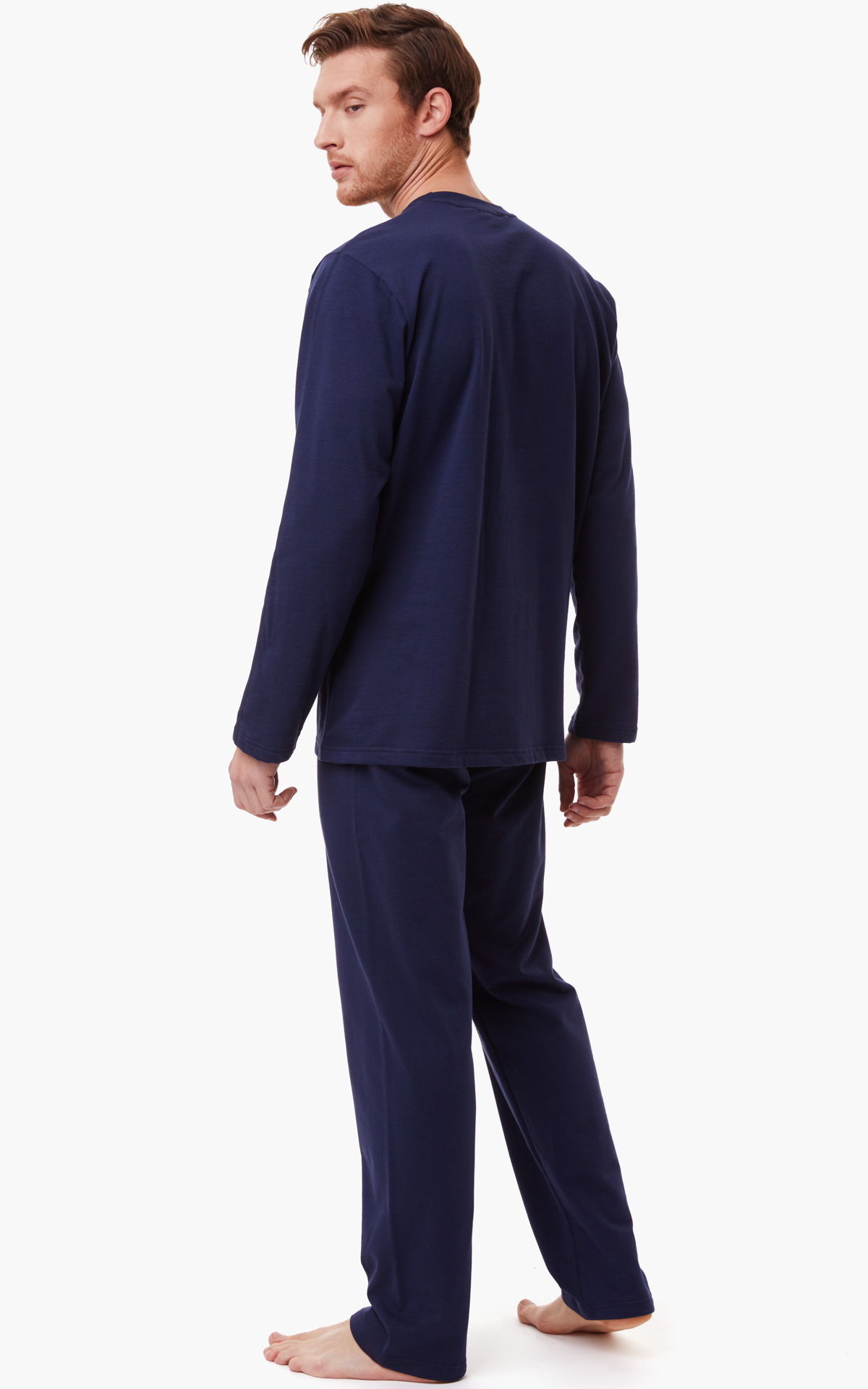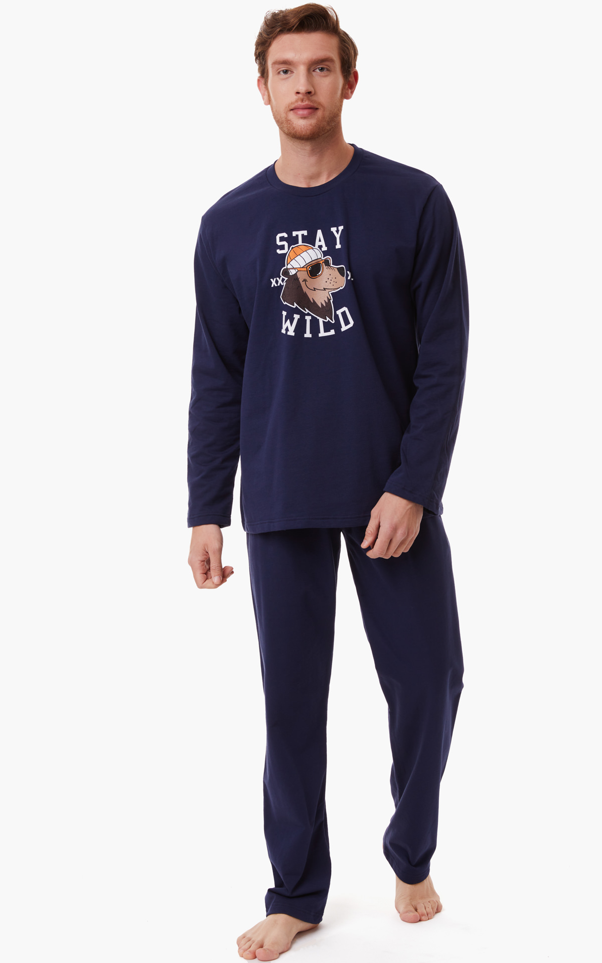 Ανδρική χειμερινή φούτερ πυτζάμα υψηλής ποιότητας. Το σετ περιλαμβάνει μπλούζα με στρογγυλή λαιμόκοψη και διακοσμητικό τύπωμα στο στήθος, ίσιο μονόχρωμο παντελόνι.