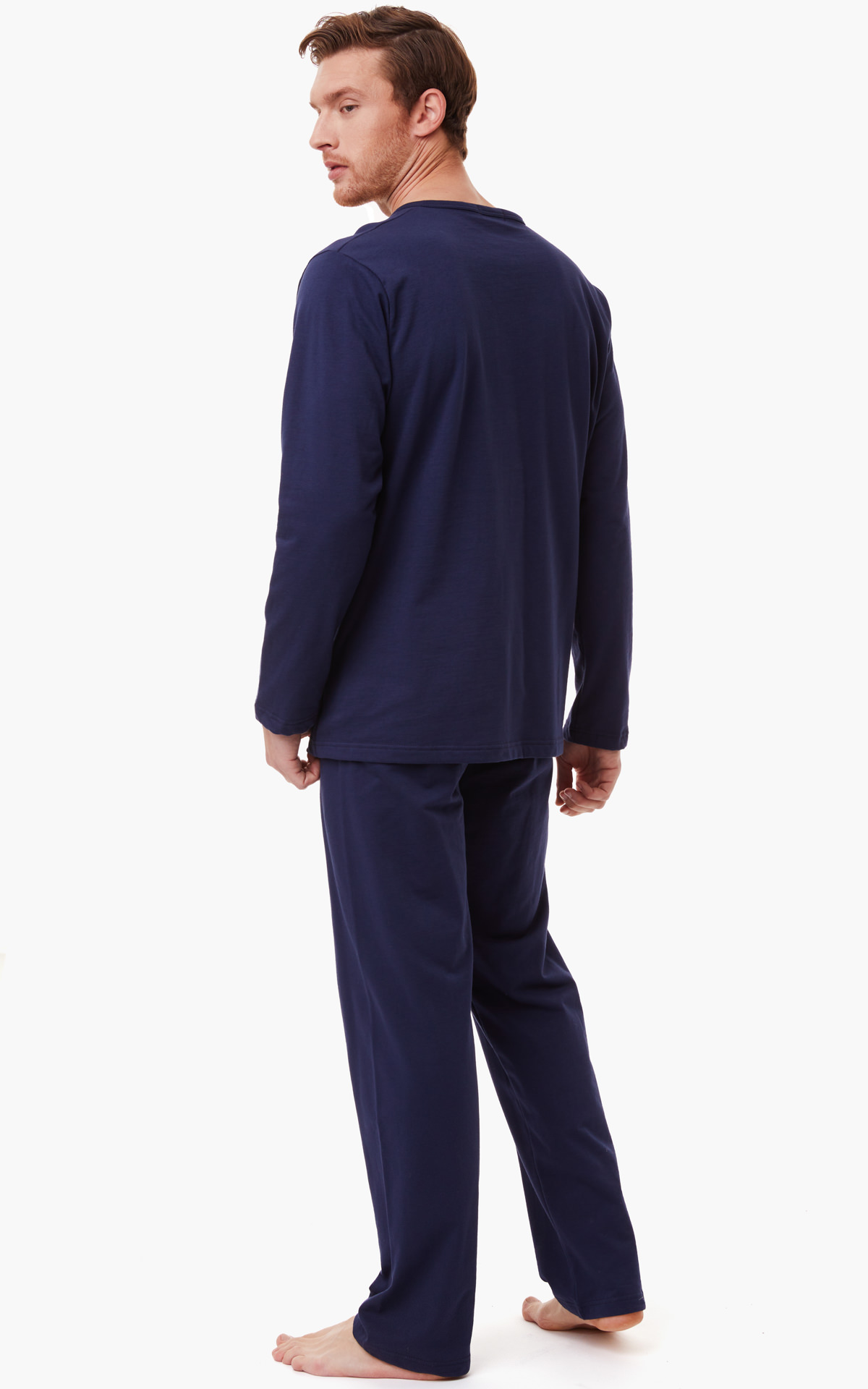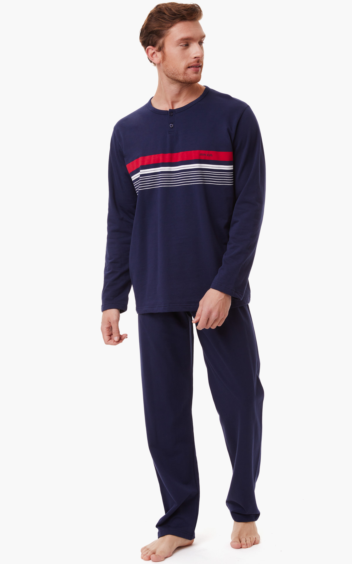 Ανδρική χειμερινή πυτζάμα από 100% βαμβακερό ύφασμα υψηλής ποιότητας. Το σετ περιλαμβάνει μπλούζα με στρογγυλή λαιμόκοψη, πατιλέτα με δύο κουμπιά και διασκομητικό τύπωμα με ρίγες και λογότυπο Minerva, ίσιο μονόχρωμο παντελόνι.
