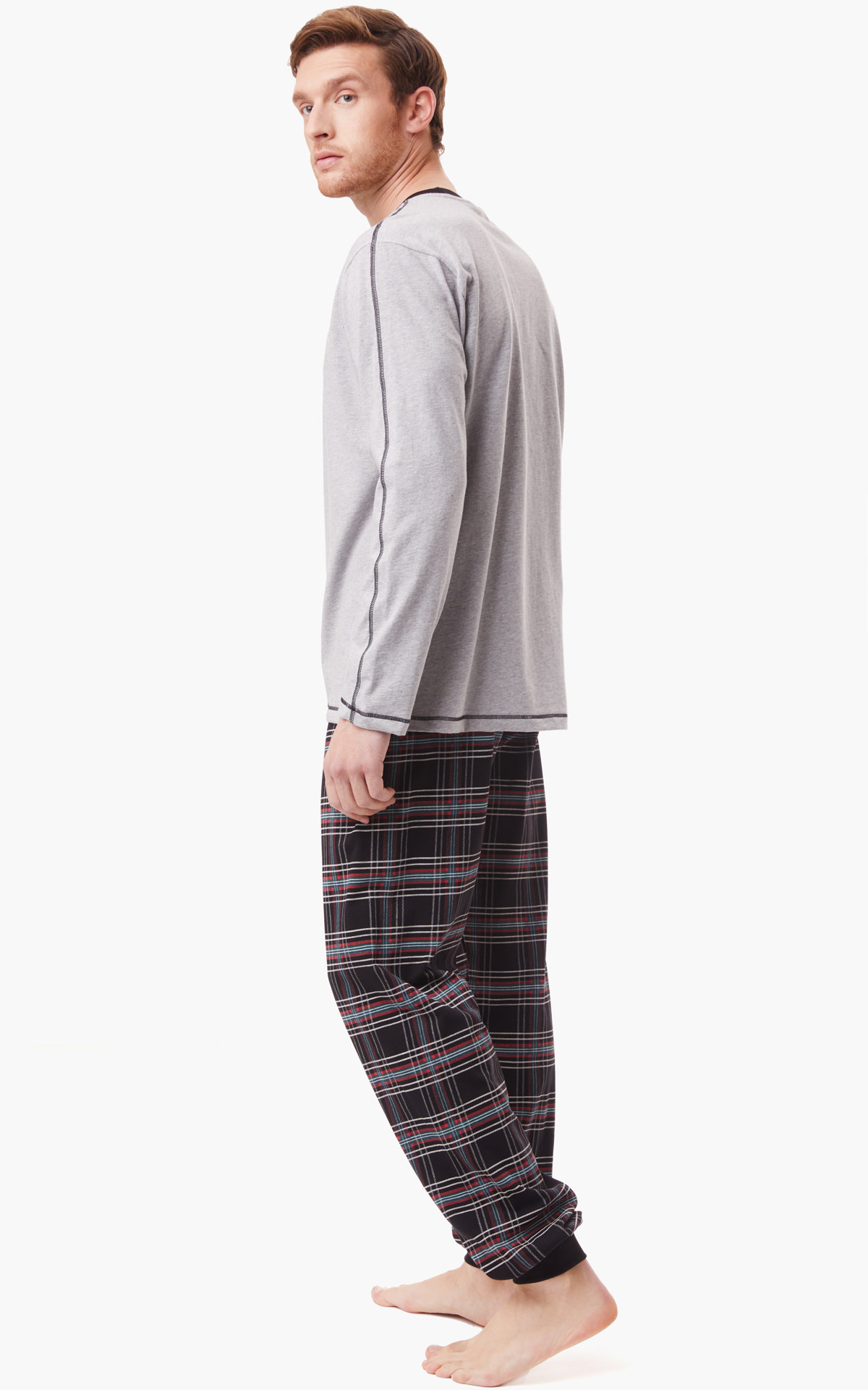 Το σετ περιλαμβάνει μπλούζα με στρογγυλή λαιμόκοψη και διακοσμητικό τύπωμα στο στήθος, καρό παντελόνι με μπάσκες