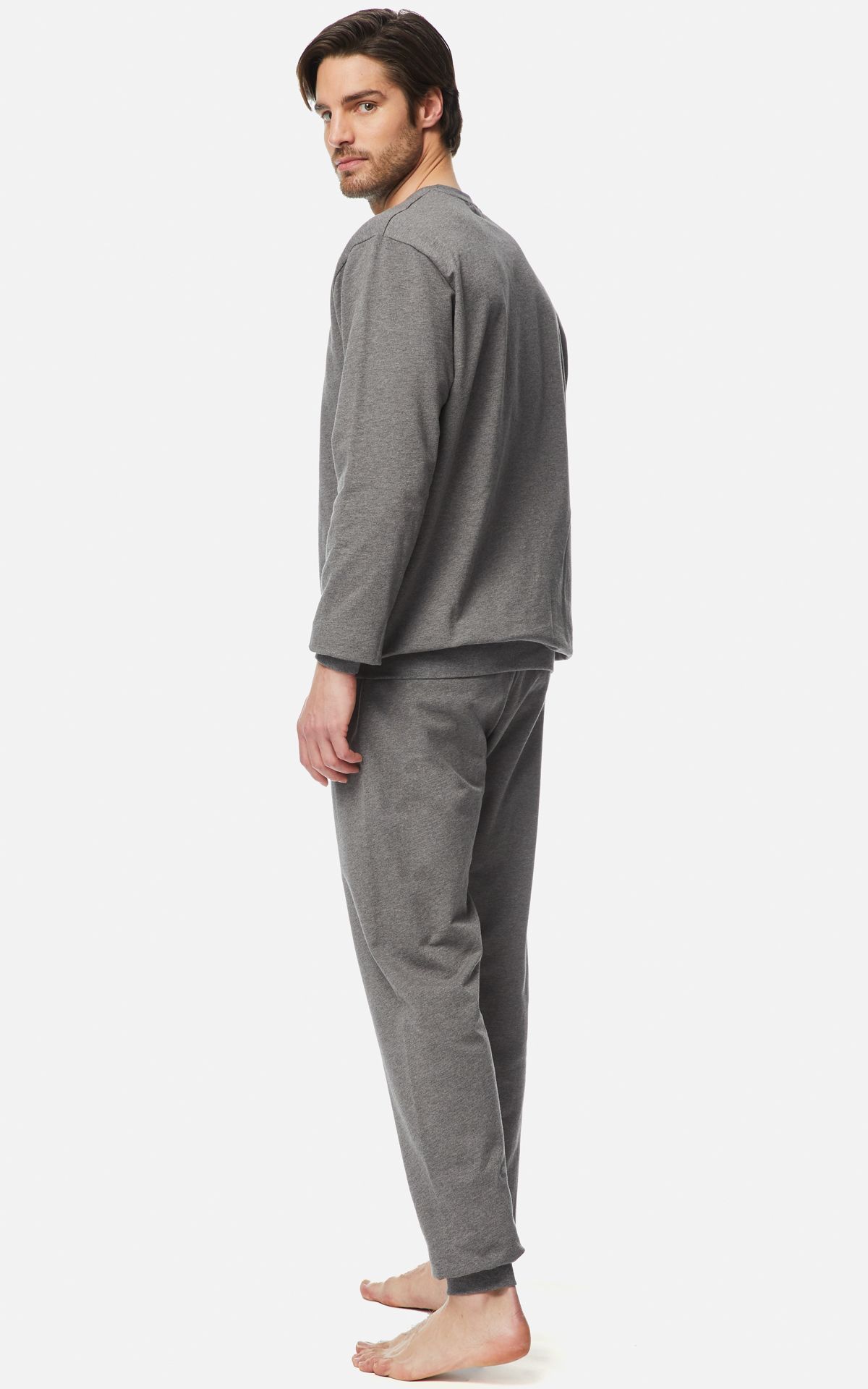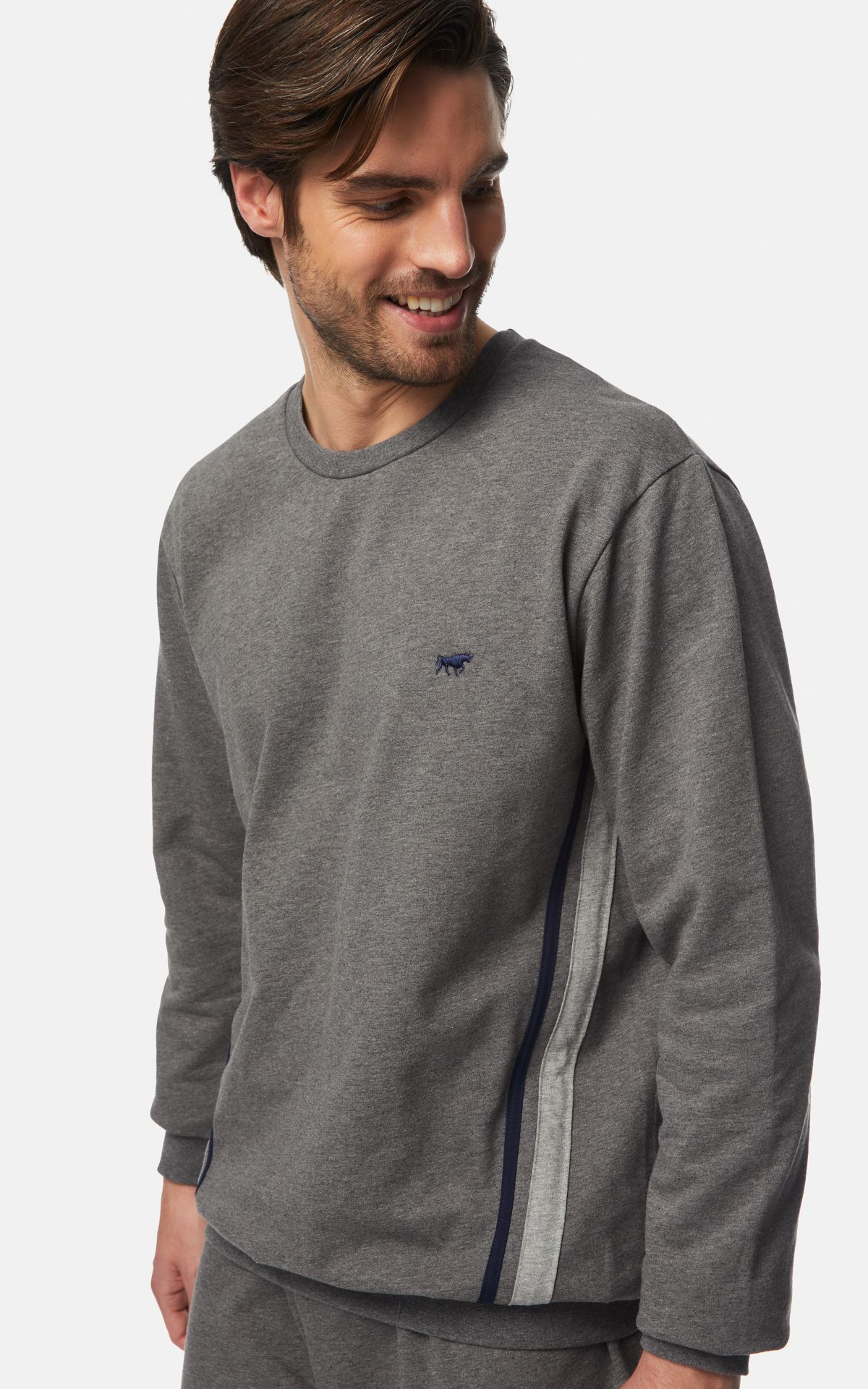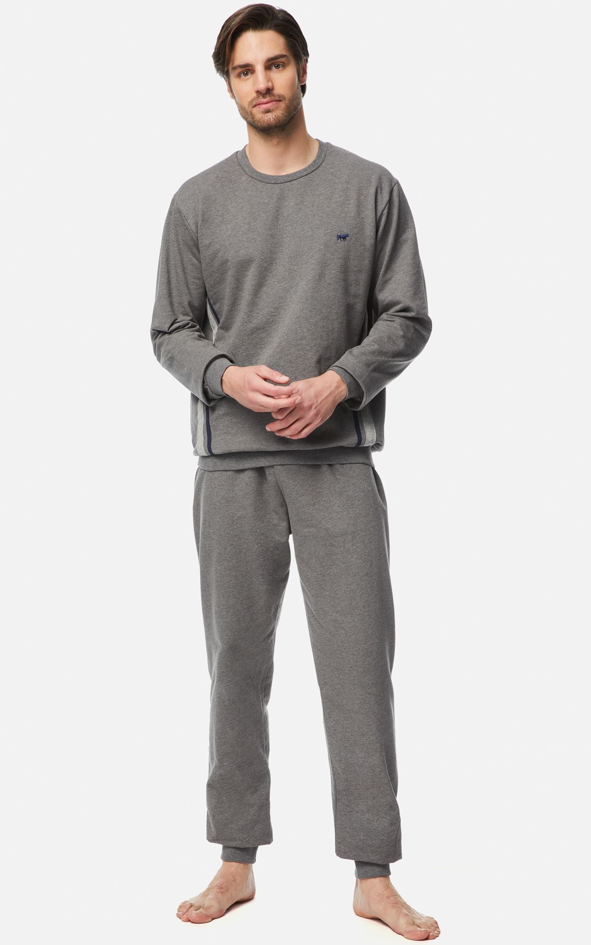 Αντρική χειμερινή φούτερ πιτζάμα από 100% βαμβακερό ύφασμα υψηλής ποιότητας. Το σετ περιλαμβάνει μονόχρωμη μπλούζα με στρογγυλή λαιμόκοψη και ρίγες στα πλαϊνά. Συνδυάζεται με μονόχρωμο μακρύ παντελόνι με μπάσκες.