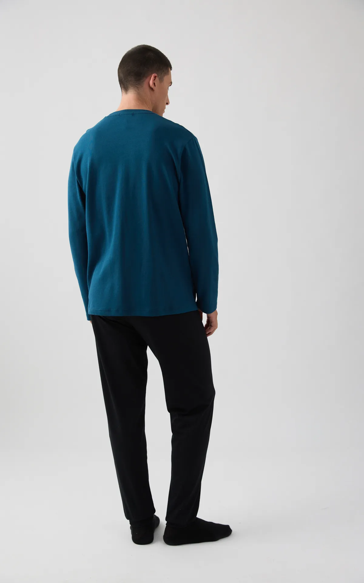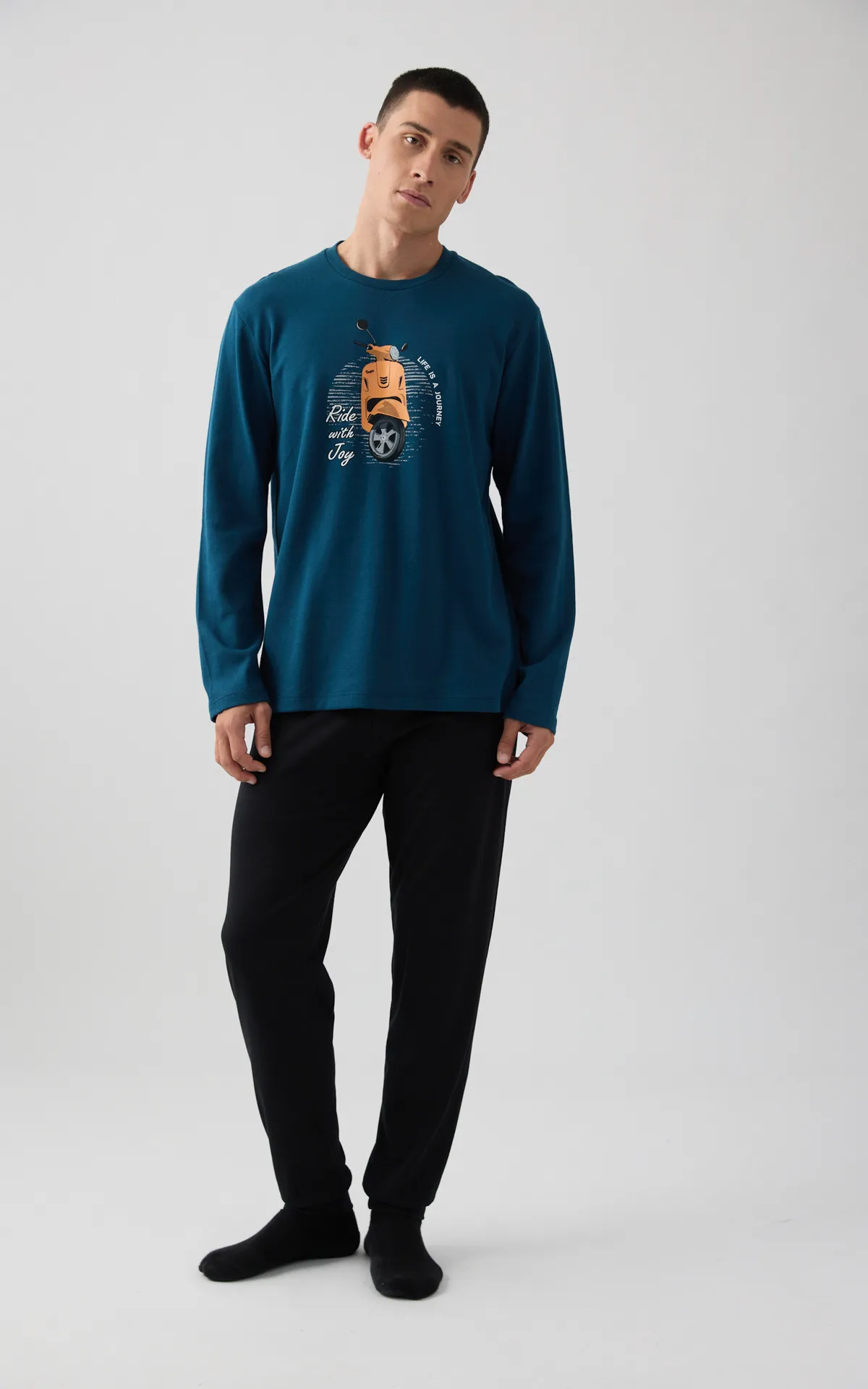 Χειμερινή πυζάμα, από 100% βαμβάκι εξαιρετικής ποιότητος. Το σετ περιλαμβάνει μπλούζα με στρογγυλή λαιμόκοψη, τύπωμα στο στήθος και παντελόνι με μπάσκες στα τελειώματα.