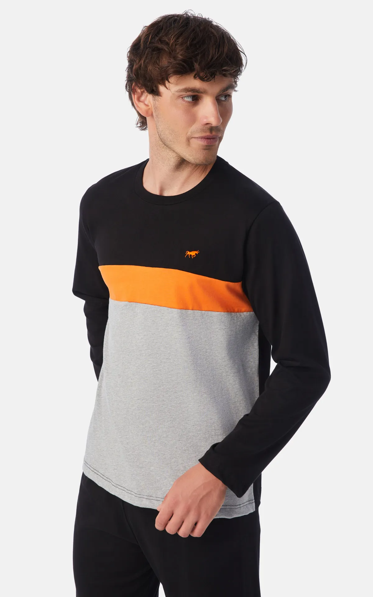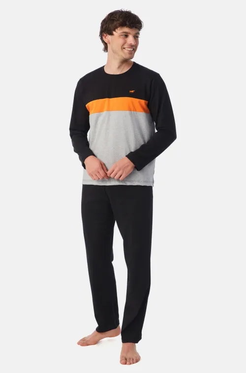 Ανδρική χειμερινή πυζάμα από 100% βαμβακερό ύφασμα, υψηλής ποιότητος. Το σετ περιλαμβάνει μπλούζα με 3 χρωματικούς συνδυασμούς , μικρό τύπωμα στο στήθος και παντελόνι ίσιο.