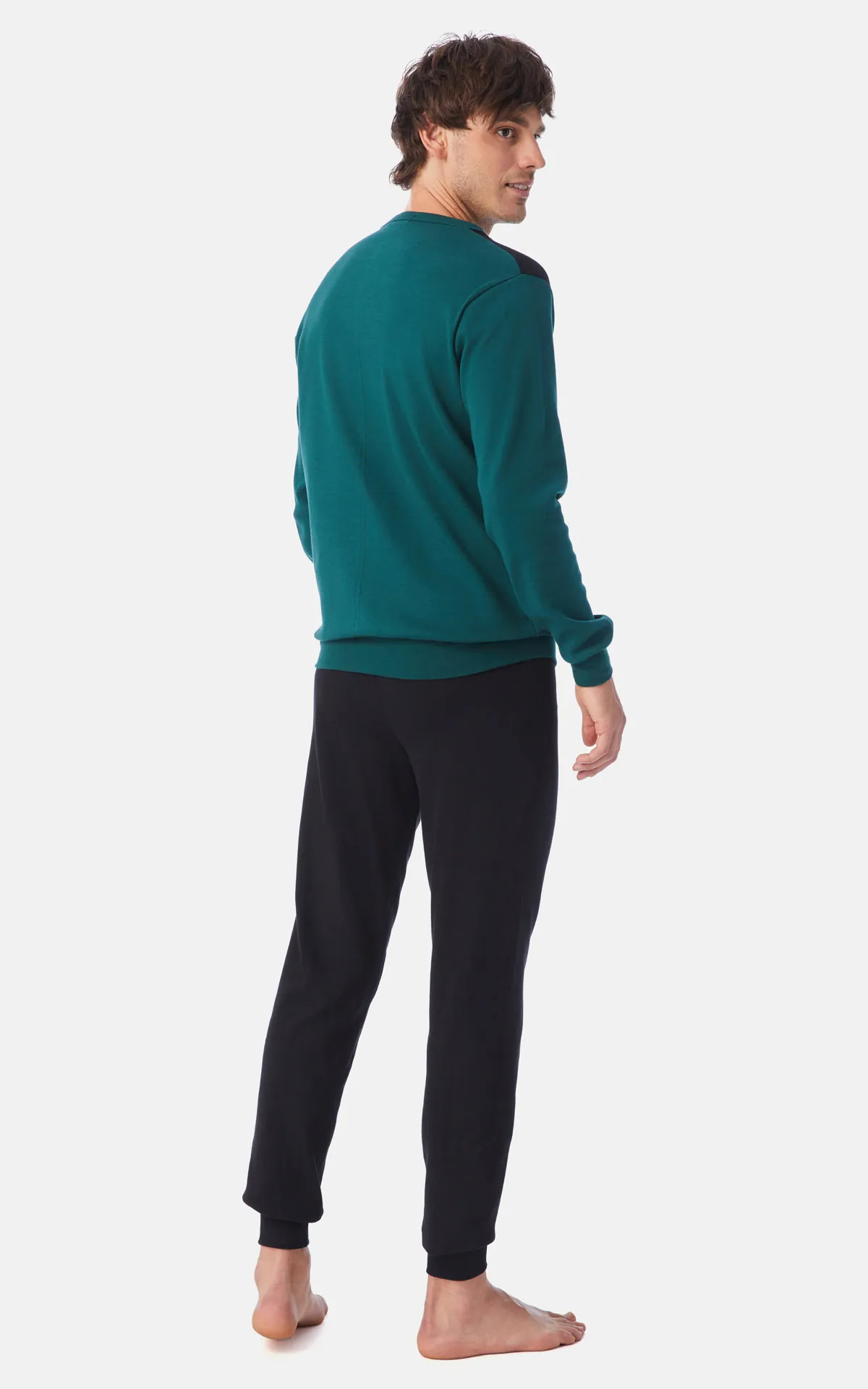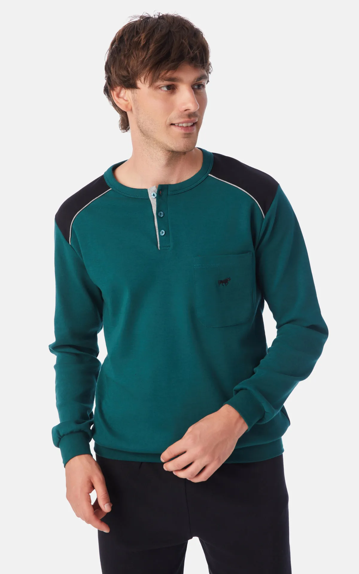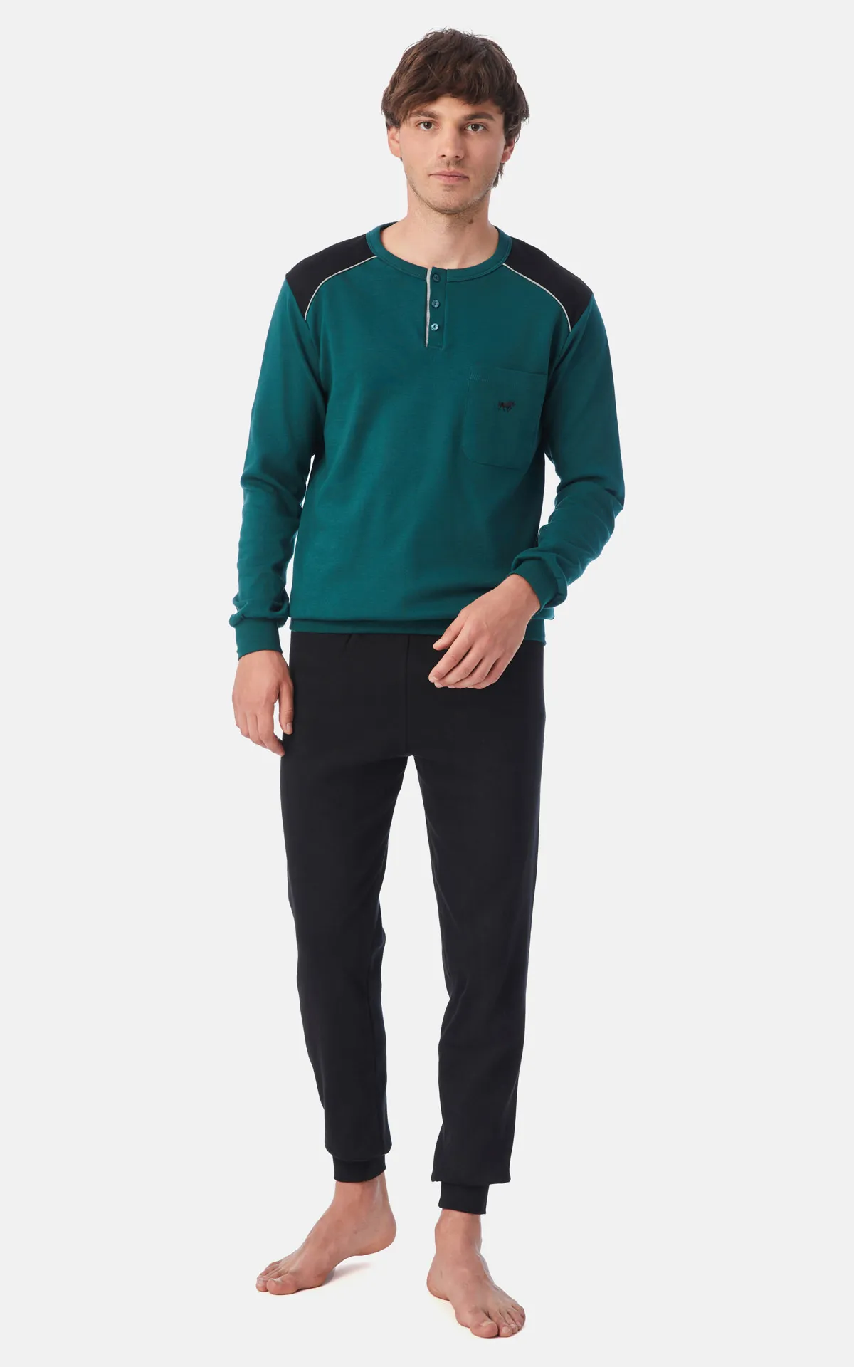 Ανδρική χειμερινή πυζάμα από 90% βαμβακι και 10% ναυλον. Το σετ περιλαμβάνει μπλούζα με πατιλέτα και κουμπιά, τσέπη στο στήθος και παντελόνι με μπάσκες στα τελειώματα.