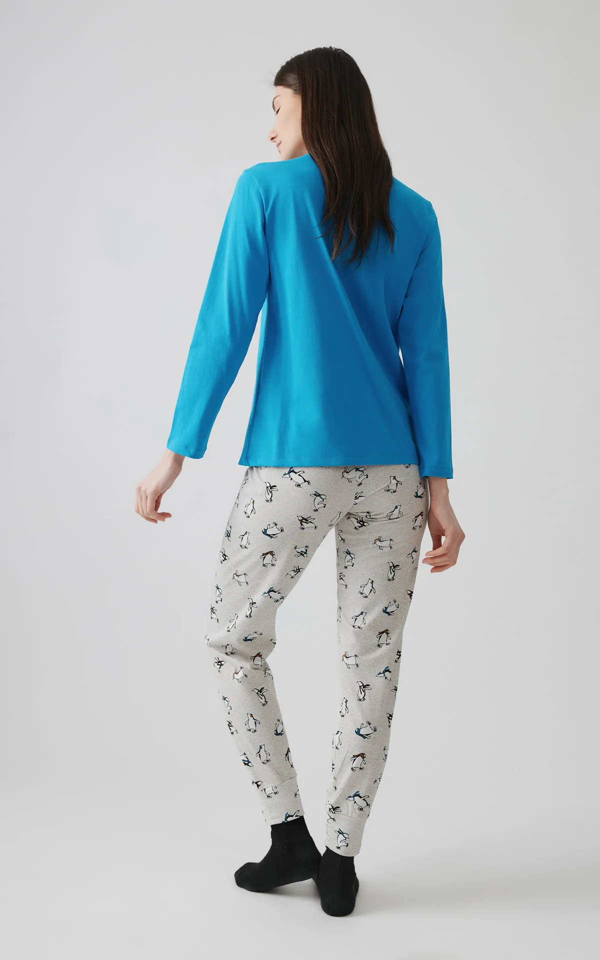 Xειμερινή πιζάμα από 100% βαμβακερό ύφασμα υψηλής ποιότητας. Το σετ περιλαμβάνει μονόχρωμη μακρυμάνικη μπλούζα με τύπωμα στο στήθος και μακρύ τυπωμένο all over παντελόνι, με μπάσκες στα τελειώματα.